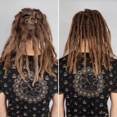Don’t want to maintain them yourself or feeling overwhelmed? Come see us! You are welcome to set up appointments to get routine maintenance done. This can be extremely helpful in the beginning when your dreads are still locking and maturing. We recommend coming in every 6-8 weeks for new dreadlocks in order to keep them on the right track. After dreadlocks have matured, we recommend coming in every few months/as needed to clean them up and tighten the roots. During maintenance appointments, we work on separating dreads, tightening the roots, crocheting in the loose hair, pulling in loops and bumps, stengthening weak spots and whatever else you may need!
